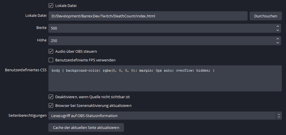 In dieser Szene erstellst du eine neue Browser Quelle, benennst sie [Browser] Deathcounter und machst die Einstellungen genau wie im folgenden Bild:
