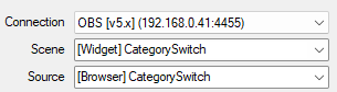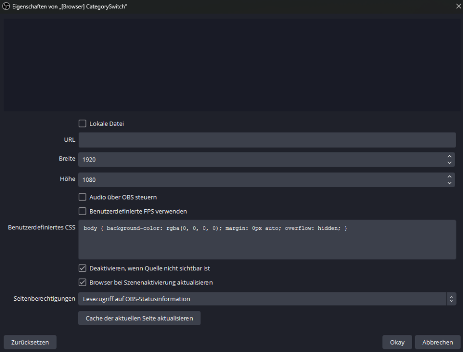 In dieser Szene erstellst du eine neue Browser Quelle, benennst sie [Browser] CategorySwitch und machst die Einstellungen genau wie im folgenden Bild: