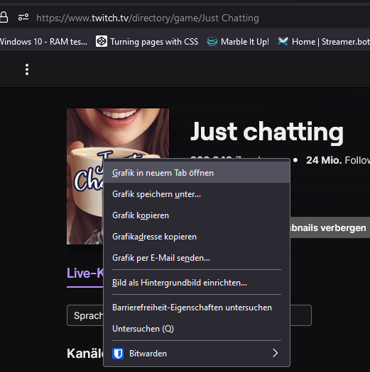 Die einfachste Art und Weise die ID zu finden ist indem du auf Twitch selbst auf eine Kategorie gehst, Rechtsklick auf das Kategorie Bild, “Grafik in neuen Tab öffnen”. Wenn du das mit der “Just Chatting” Kategorie machst, sieht es wie folgt aus: